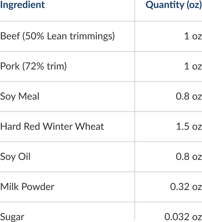 Figure 2 – The hot dog recipe featuring ingredients and weights for the raw materials components.