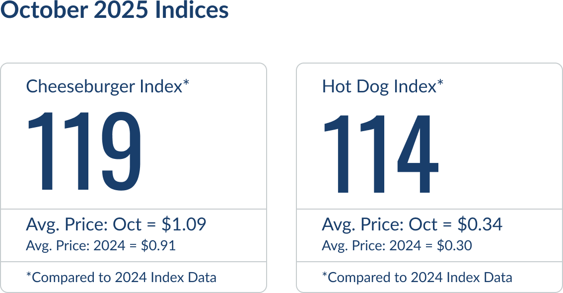 Figure 1 – Both the Cheeseburger and the Hot Dog Index continue falling from their July highs, expected to level out going into the new year.