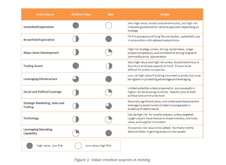 Much can be learnt from how mining companies have created value in the past, and we have outlined in below the broad areas of value creation we typically see in the industry. In interpreting this analysis, two further questions need to be overlaid, firstly what is relevant to a firm’s particular situation, most importantly its existing competencies and assets, and secondly how might value creation opportunities shift due to future trends and events in the external environment.