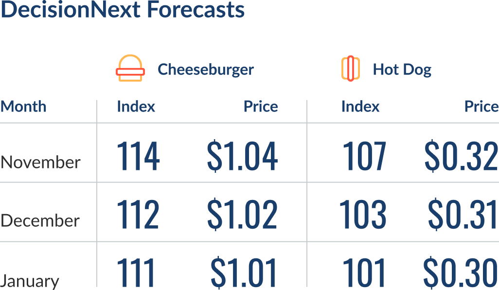 Input costs remain historically elevated in year-over-year terms. And yet, the November DecisionNext Finished Goods Index shows both Cheeseburger and Hot Dog Indexes settling after months of mid-year volatility.