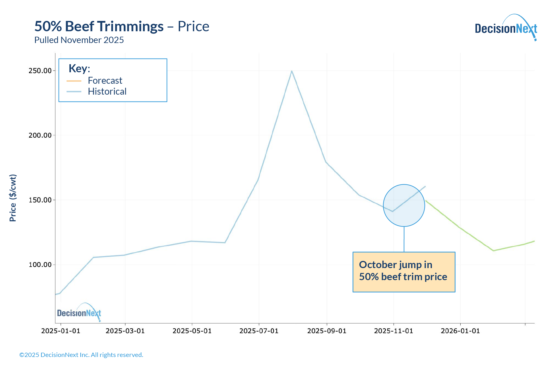 - 50% Lean Beef Trimmings: still nearly double year-ago levels ($1.41/lb vs. $0.67 in 2024).