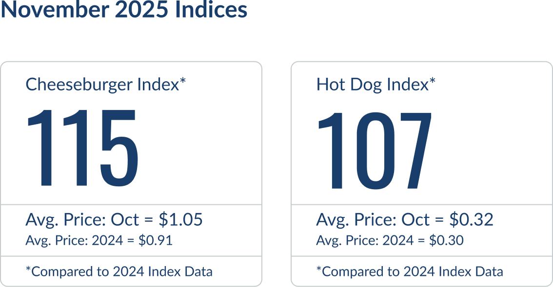 Input costs remain historically elevated in year-over-year terms. And yet, the November DecisionNext Finished Goods Index shows both Cheeseburger and Hot Dog Indexes settling after months of mid-year volatility.