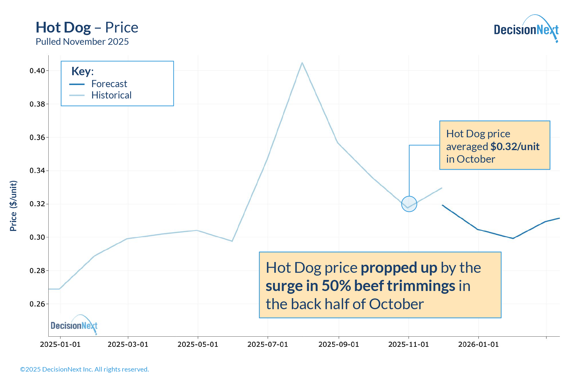 It is worth noting that there was a sharp increase in price in the back half of October. This spike was almost entirely driven by the surge in 50% lean beef trimmings. This increase, which reflects an atypical seasonal movement, is likely due to a surge in the volume of formula and forward orders that have occurred recently. Consequently, there has been less than anticipated volume in the market which caused the spot market prices to increase. It should be noted that in October, 50% lean beef trimmings made up 30% of the input costs for the hot dog.