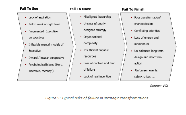 Most strategic transformations fail because either the strategy is not appropriate for the challenges faced (fail to see), or if the strategy is appropriate the business does not act (fail to move), or the business cannot simply sustain the effort required to achieve transformation (fail to finish). Typical, but non-exhaustive causes of these failures are outlined in Figure 5.